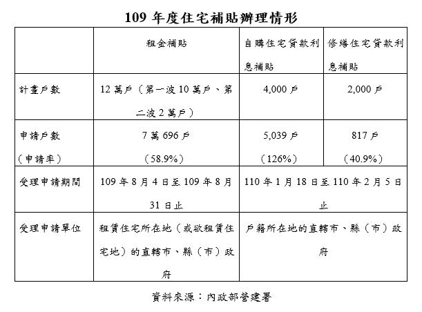 家庭組成部分,已放寬年齡及戶籍相關規定,不論單身或已婚,都有機會獲得補貼。根據營建署統計,截至8月21日止,租金補貼申請戶數7萬696戶,至於自購住宅貸款利息補貼申請戶數5,039戶、修繕住宅貸款利息補貼申請戶數817戶。